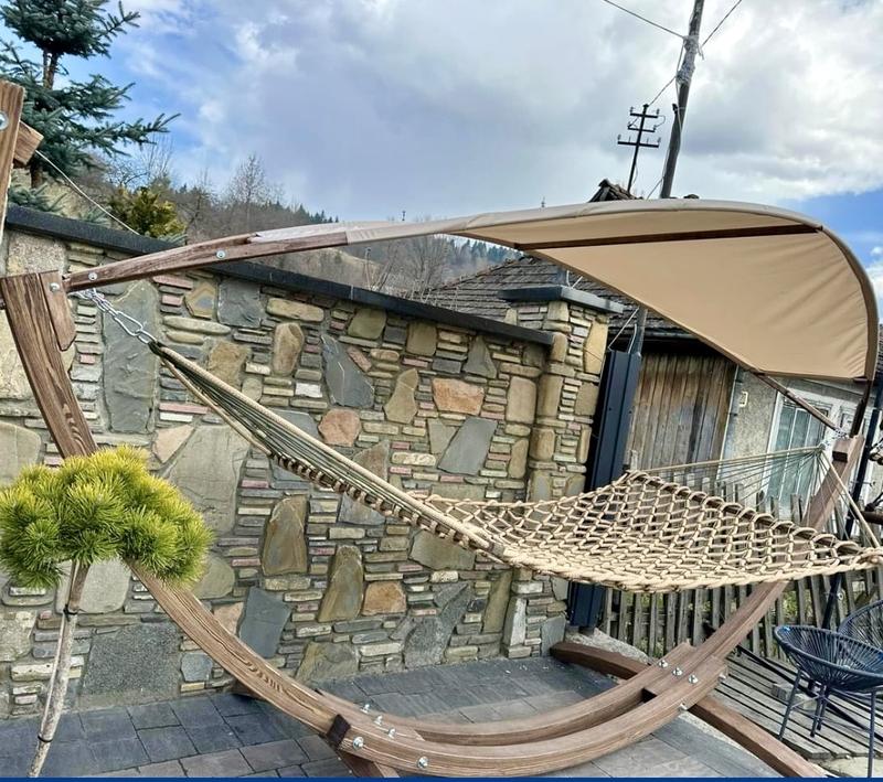 Дерев’яний тримач для гамака виготовлений із склеєного соснового бруса (товщина бруса 80*80 мм).Гамак 10 мм товщина канату . Із застосуванням водовідштовхуючих, нетоксичних матеріалів, покриття оливо-віск Borma (Італія) .Висока якость та міцність монтажно-підвісних деталей. Стійкий до дії сонячного проміння, а також до атмосферних умов. Допустиме навантаження до 250 кг. Загальна довжина 4 м , висота 1,5 м, ширина 1,5 м Вага 50 кг . Можна до укомплектувати гамаком 16 мм товщина канату за ціною 2800 грн та 10 мм за ціною 2100 грн