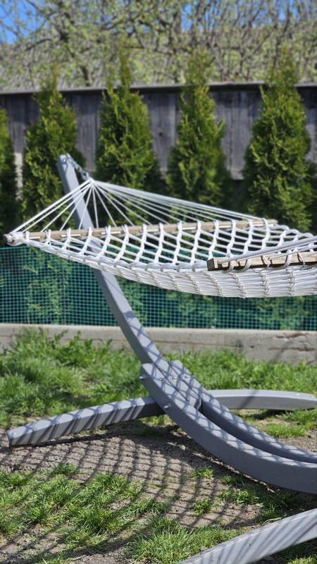 Гамак из полипропиленового шнура толщиной 9 мм. (деревянная стойка не входит в комплект) Планка с обеих сторон гамака из ясеня. Размеры гамака: длина 3,6 м, ширина 1,3 м. Длина полотна (ложе) 2 м. Весовая нагрузка до 150 кг.