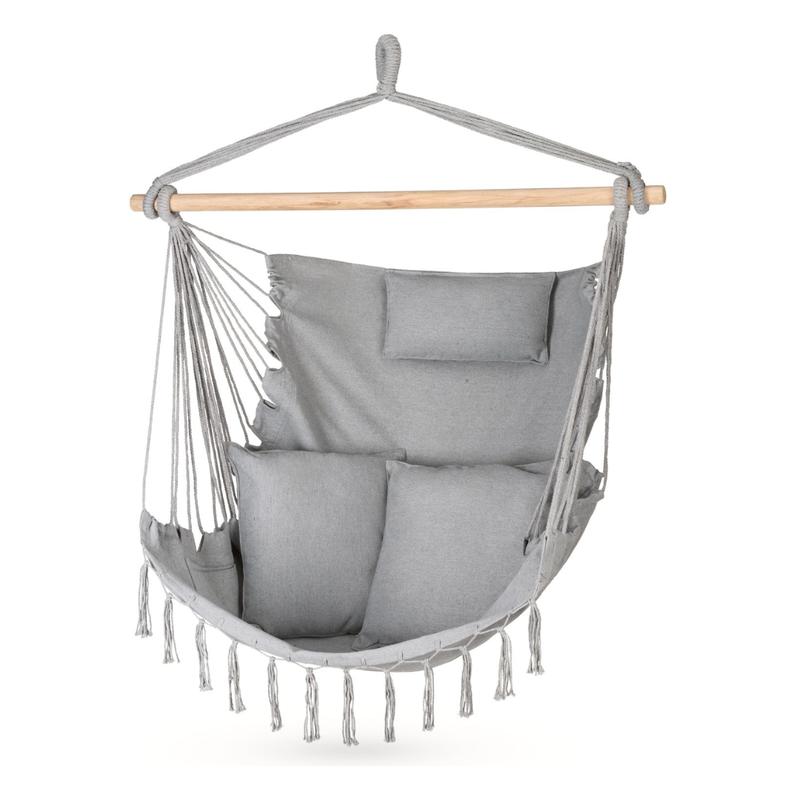 Бразильское кресло - гамак Outtec Boho XXL серый Подвесное бразильское кресло от Outtec в стиле бохо - идеальный способ отдохнуть в саду, на террасе или балконе в солнечные дни. Гамак изготовлен из прочного материала, представляющего собой комбинацию хлопка и полиэстера. Эта ткань характеризуется стойкостью к истиранию и механическим повреждениям. Также благодаря этой ткани максимальная нагрузка на гамак составляет 140 кг. Простой монтаж и компактные размеры дают возможность разместить его даже на маленьком балконе. Также вы можете установить это кресло в гостиной или спальне. Воздушная структура ткани обеспечивает комфортный отдых в жаркие дни. Основные характеристики: - подушки в комплекте - 2 шт 38х38 см - прочный, стойкий к истиранию материал - толстые плетеные шнуры - материал: 70% хлопок, 30% полиэстер - ширина балки: 100 см - диаметр балки: 3,5 см - максимальная нагрузка: 140 кг - ширина: 100 см - высота: 130 см - глубина: 75 см - длина бахромы (включая макраме): 23 см (+/-) - внутренний карман - цвет серый - гарантия: 24 месяца Легкий и компактный Гамак легок и компактен в сложенном виде, поэтому его всегда можно взять с собой в путешествие или отпуск и приятно проводить время на свежем воздухе! Дома или в саду Бразильское кресло будет эстетически выглядеть как в вашем саду так и в вашей гостиной. Преимуществом данной модели является воздухопроницаемость материала, что удобно в использовании в жаркие дни. Долговечный материал Выбирая эту модель, вы можете быть уверены, что гамак будет долговечным. Ткань устойчива к истиранию, поэтому вам не придется беспокоиться о быстром износе.