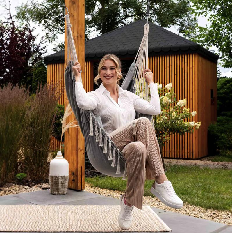Бразильское кресло - гамак Di Volio Fira Бразильские качели Fira от Di Volio - это привлекательное и чрезвычайно удобное подвесное кресло, которое позволит вам отдохнуть в комфорте вашего дома или на природе среди природы. Кресло-качели можно повесить в помещении как оригинальную альтернативу традиционному креслу, а также на улице - в саду, на балконе или террасе. Благодаря своему стильному дизайну кресло Fira Brazilian будет красиво смотреться в окружении садовых растений и придает интерьеру и уюту. Кресло-гамак изготовлено из прочной и воздушной ткани, украшено хлопчатобумажной бахромой, которая подчеркивает эстетичность качелей, отсылая к теплому, приближенному к природе стилю бохо. Качели для дачи Fira доступны в двух цветовых вариантах - светло-серый с бежевыми подушками и темно-серый с черными подушками. В комплект входит полотняная сумка для хранения и транспортировки качелей и практичный держатель для бутылки. Прочная ткань Кресло-гамак Fira изготовлено из прочной и приятной на ощупь ткани. Сочетание натурального хлопка и полиэстера делает материал дышащим и воздушным, и в то же время крепким. Благодаря синтетическим волокнам в пряже, ткань для качелей более устойчива к разрывам, не мнется, а ее цвет остается постоянным, что гарантирует ее длительный срок службы. Удобное сиденье Кресло-гамак подвесные качели приятно обнимут вас, даря ощущение комфорта во время расслабляющего покачивания. Кроме того, садовые качели оснащены двумя подушками подобранного цвета, которые обеспечивают хорошую поддержку спины, стабилизируют положение и позволяют удобно расположиться в кресле. Практический карман внутри сиденья позволяет положить книгу, телефон или закуски, а благодаря входящему в комплект держателю для бутылки вы также можете иметь любимый напиток под рукой. Простая сборка Установить качели Fira легко и быстро. В саду вы можете повесить его на толстую ветку дерева, позволяющую ему свободно раскачиваться, а в комнате или на балконе вы можете повесить его на крючки, прикрепленные к потолку. Повесить качели можно двумя способами - на деревянный брусок и один крючок или на две лямки и два крючка. Все крепежные элементы входят в комплект. Качели выдерживает нагрузку до 135 кг. Основные характеристики: - Торговая марка: Di Volio - Модель: DV-046BHC Fira - Материал изготовления: 65% полиэстер + 35% хлопок - Максимальный вес пользователя: 135 кг - Цвет: Серый - Количество человек/мест: 1-местный - Вес: 4 кг - Размер упаковки: 102/19/19см - Длина: 150см - Длина веревки: 100см - Общая высота: 170см - Ширина: 120см - Для домашнего использования - Для самостоятельного монтажа - Держатель для напитков - Внутренний карман - Набор подушек - 2 карабина - 2 х монтажные ремни - Гарантия: 24 месяца Преимущества: Hop-Sport - это больше, чем просто интернет-магазин: Гарантия от производителя: Задержка с доставкой? Брак товара? Мы вернем 100% стоимости и подарим приятный бонус к следующей покупке! Ваша радость - наш приоритет. Собственный импорт: Мы напрямую сотрудничаем с производителями, поэтому предлагаем самые выгодные цены на рынке. Нашли дешевле идентичный товар? - звоните, и мы сделаем вам предложение, от которого невозможно отказаться! Проверка перед отправкой: Каждый товар проходит тщательную проверку перед отправкой. Мы ценим ваше доверие и гарантируем, что вы получите только лучшее. Надежная упаковка: Мы 