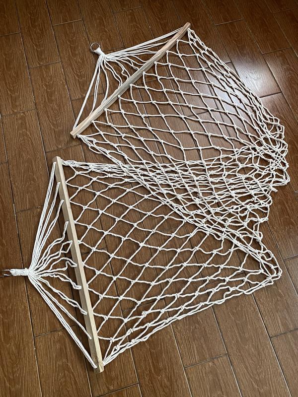 Гамак-сетка с древесными перекладинами на металлических кольцах. Диаметр колец: 4,5 см. Материал: ткань хб, дерево. Размер: 240*80 см. Размеры ячойки в свободном виде: 6*12 см Размеры ячойки в натянутом виде: 12*15 см. Такой гамак отлично подойдет для отдыха дома и на природе.
