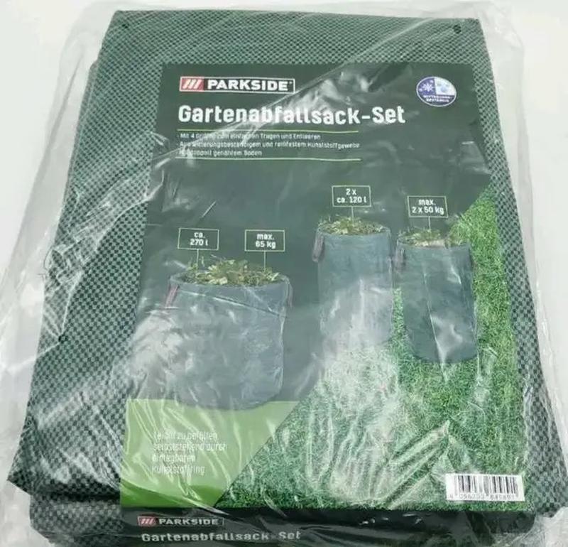 Набор состоит из 3-х мешков: 1 - 270 л и 2 - по 120 л. Мешок для сада Parkside предназначен для сбора различного садового мусора такого как опалые листья, скошенная трава, сорняки и т.д. Размер: 76х67см, 50×45см Объем: 270л, два по 120л Максимальный вес: 65 кг и два по 50кг Состав: пластик, текстиль Прочный, устойчивый к разрывам и стойкий к погодным условиям, имеет прошитое двойное дно и специальные ручки (4 шт.), которые значительно облегчают транспортировку или перенос в нужное место. Мешок для сада занимает мало места, так как имеет складную конструкцию.