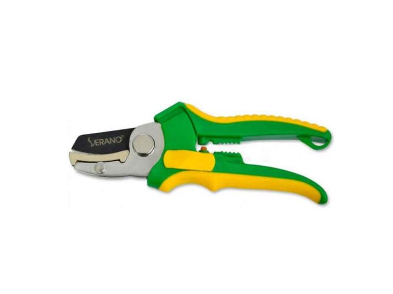 Секатор VERANO 71-810 предназначен для обрезки крон деревьев, ягодных и декоративных кустарников, нарезки живцов и других работ. Секатор режет ветки диаметром до 19 мм, срез прямой. Хорошо заточенные, тонкие лезвия позволяют обрезать ветки в труднодоступных местах. Лезвия изготовлены из высокоуглеродистой стали с тефлоновым покрытием. Длина секатора 210 мм. Прорезиненные рукоятки обеспечивают надежный хват во время работы.