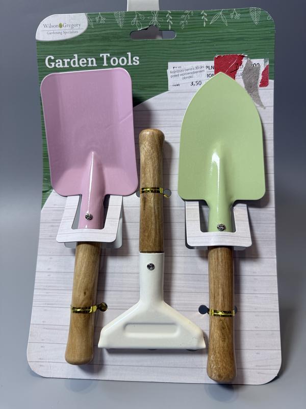 Набір садових інструментів: 2 лопатки, граблі. Основа метал, тримач дерево. Можна як дитячий набір. Довжина: зелена лопатка 21,5см, граблі 15,5см, рожева лопатка 20,5см.