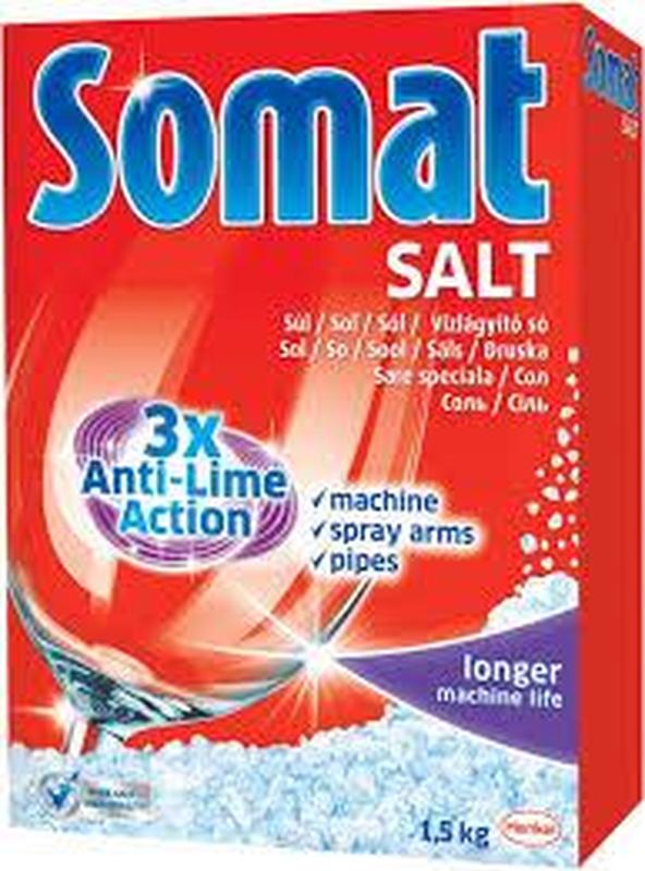Соль для посудомоечных машин Somat Тройного действия 1.5 кг (9000100147293) Назначение - для смягчения воды, объем/вес - 1.5 кг Средство для мытья посуды Somat Соль Тройного действия 1,5 кг (9000100147293) предотвращает образование известкового налета и повышает эффективность вашей посудомоечной машины. Хранить при температуре от +5 °C до +40 °C. После истечения срока годности утилизировать как бытовые отходы. Срок годности: 2 года с даты производства (смотрите на упаковке). Соль несъедобна и не подходит для приготовления пищи. Беречь от детей. Риск серьезного повреждения глаз. При попадании в глаза обильно промыть водой. Добавьте соль Somat в отделение для соли, учитывая рекомендации производителя Вашей посудомоечной машины. Если в Вашей посудомоечной машине не предусмотрен индикатор соли, мы рекомендуем регулярно добавлять соль Somat. Так вы всегда можете быть уверены в том, что машина будет готова к работе тогда, когда она нужна.