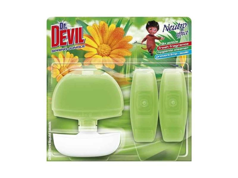 Жидкий туалетный блок Neutro с добавлением вещества, нейтрализующего неприятные запахи. Очищает и предотвращает образование накипи. Dr.Devil — это концентрированный жидкий туалетный блок, который будет очищать и мыть ваш туалет при каждом смывании. Содержит туалет гигиенично чистым и предотвращает образование накипи, а благодаря уникальной системе дозирования продукта при каждой промывке выделяется одинаковое количество ароматизированного жидкого цемента, выдерживающего до 400 полосканий. Использование: Вставьте контейнер в держатель и нажмите на него, чтобы он зафиксировался при нажатии щелчков. Не снимайте крышку, проткните ее, прикрепив к держателю. Для достижения наилучшего эффекта поместите Dr.Devil в поток воды, образующийся при промывании. Когда бутылка опорожнеет, замените ее новым картриджом.