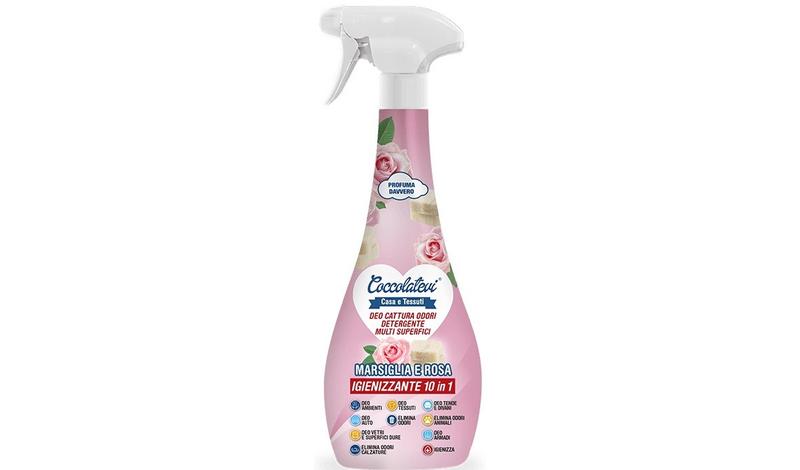 Coccolatevi Deo 10in1 Marsiglia e Rosa – это многоцелевое средство для чистки различных поверхностей, освежитель и нейтрализатор неприятных запахов с ароматом марсельского мыла и розы. Его можно использовать как освежитель для тканей, штор и диванов, а также как средство для мытья стекла и твердых поверхностей. Нейтрализует запахи и ароматизирует салон автомобиля. Нейтрализует неприятные запахи спортивной обуви и технических тканей. Дезодорирует и ароматизирует воздух в помещениях. Устраняет запахи дыма и домашних животных, тщательно дезинфицирует и очищает твердые поверхности, оставляя приятный аромат.