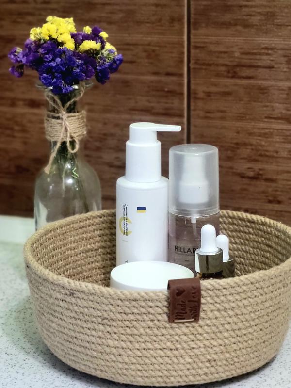 Под заказ Корзина из жгута ручной работы украшена биркой из натуральной кожи, идеально подойдет под любой интерьер кухни, спальни или ванной комнаты Вы можете в нем сохранять свою уходовую косметику или парфюм Имеет следующие размеры: d дна 20 см высота 8 см Под заказ в любых размерах