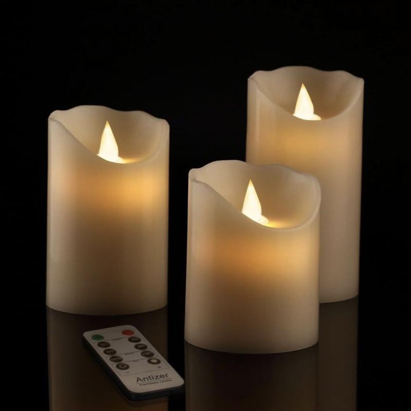 В НАБОРЕ: Три свечи, высотой 10 см, 12,7 см и 15 см, каждая диаметром 8 см дюйма. 1 пульт дистанционного управления. Батарейки НЕ входят в комплект. Свечи с реалистичным танцующим светодиодным пламенем позволяют безопасно добавить праздничное или романтическое настроение в любую комнату. ТЕХНОЛОГИЯ МЕРЦАЮЩЕГО ПЛАМЕНИ создает иллюзию настоящего пламени. Каждая светодиодная лампа обеспечивает срок службы 50 000 часов. Свечи работают от 2 батареек типа АА, не входят в комплекте. 10-КЛАВИШНЫЙ ПУЛЬТ ДИСТАНЦИОННОГО УПРАВЛЕНИЯ с радиусом действия 5 метров позволяет. Функция таймера позволяет планировать горение свечи с интервалом в 2, 4, 6 и 8 часов. Гладкого классического цвета слоновой кости, материал напоминает воск идеально подходят для книжных полок, спален, а также в качестве безопасных акцентов в праздничных венках и центральных предметах. Смотрите другие объявления Е3\15