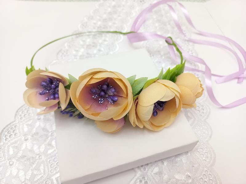 Венок состоит из камелий и зелени. Изготовлен из искусственных материалов. Размер венка регулируется лентой. Дополнит ваш образ и пригодится на любой праздник. Дополнительные характеристики: Цвет: Бежевый Цвет: Разные цвета Цвет: Сиреневый Цвет: Фиолетовый Отделка и украшения: Ленты