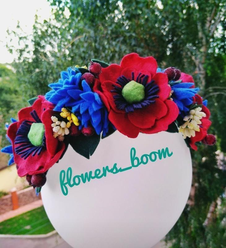 Красивый украинский венок, цветы выполнены из фетра. Основание венка в бархатной ткани, поэтому совершенно не давит голову.