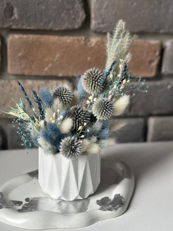 Что в ней особенного? 🌸 Голубо-белые оттенки – для свежести и легкости. 🌿 Сушеницы, которые не потеряют свой внешний вид, даря красоту долгие годы. 🪴 Бетонный горшок с мраморной крошкой – сочетание натуральности и современного стиля. Эта композиция создаст неповторимую атмосферу в вашем доме и станет ярким акцентом любого интерьера! ✨
