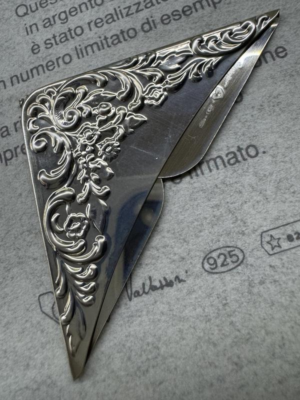 Закладка виготовлена з срібла 925 проби в обмеженій кількості. Логотип був вручну викарбуваний Виріб підписаний. На закладці є проба "925" та маркування "MI" (Мілан). Добре тримається на сторінці, не злітає.  Вага 4 гр