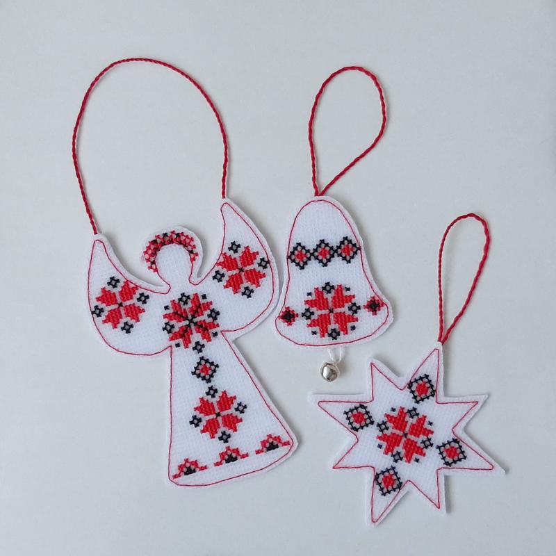Прикраса на ялинку/декор для дому набір в українському стилі. Ручна вишивка на пластиковій канві. Розмір 8×12см. ціна за набір. можна придбати окремо.