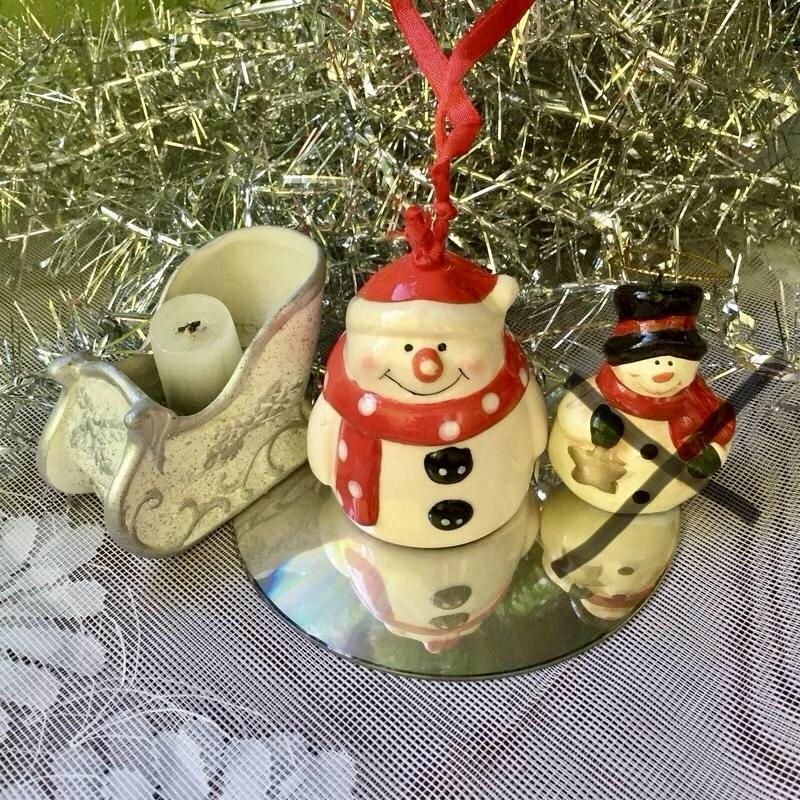 Продам одним лотом две керамические новогодние игрушки: снеговик-колокольчик и подсвечник-санчата. - Снеговик может использоваться как колокольчик. Высота 7,5 см, диаметр основания-5,5 см. ‼️Нюанс : есть трещины керамики под эмалью, не сильно заметно, если не приглядывать (это из-за того, что его использовали в качестве колокольчика) - Свечанок : узорчатые саночки с мелкими серебряными блестками Длина 8,5 см, высота 5,5 см.