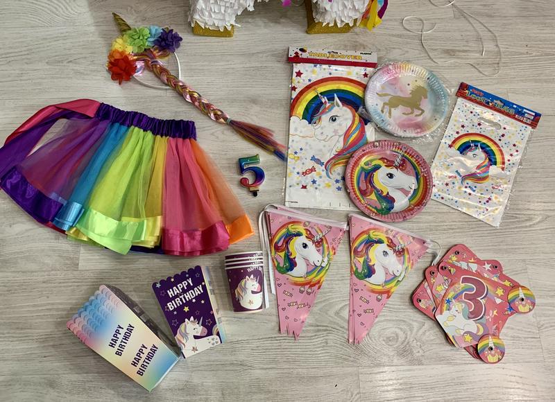 Все, що потрібно для святкування Дня Народження в стилі веселкового єдинорога! Костюм єдиноріжки (спідничка+обруч з кольоровим волоссям та рогом) Скатертина, пакетики, тарілки 13шт, стаканчики 4шт, коробочки для солодощів 8шт, розтяжки трикутниками 2шт, розтяжка «З Днем Народження». Фігурка єдинорога з мастики для торта. В подарунок більше 10 фольгованих шарів (б/у, але надуються ще раз). Ціна за весь комплект. Всі питання в приватні повідомлення. Розгляну продаж частинами.