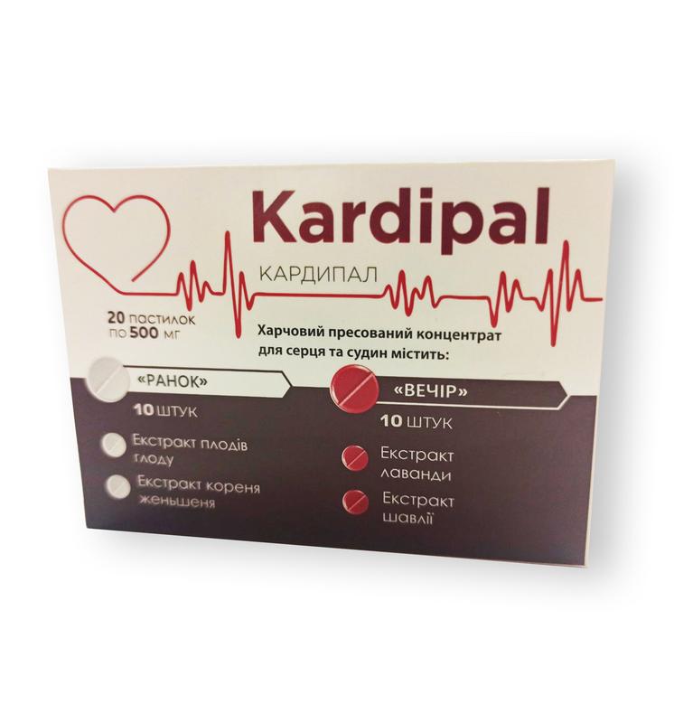 В турботі про своє здоров’я гіпертоніку краще відмовитися від прийому токсичних хімічних препаратів на користь Кардипалу, адже він допомогає навіть в найскладніших випадках. Ці таблетки мають наступні переваги: Варіативність застосування. Препарат Кардипал може використовуватися для профілактики та лікування гіпертонії. Його прийом попозитивно діє на організм в будь-якому випадку. Безпечність. Склад таблеток Кардипал включає тільки природні компоненти. Така формула точно не викличе негативних реакцій по типу інтоксикацій та побічних реакцій. Комплексний ефект. Препарат регулює артеріальний тиск, укріплює стінки судин та міокард, очищує кров, знижує рівень холестерину, покращує когнітивні процеси та роботу нервової системи. Крім того, формула нормалізує сечовидільну діяльність. Доведена ефективність. Те, що препарат Кардипал дійсно нормалізує артеріальний тиск – це не фантазія виробника, а факт, що підтверджений клінічними випробуваннями та реальними відгуками колишніх гіпертоніків. Доступна ціна. Оформивши покупку Кардипала на нашому сайті, кожен гіпертонік зможе побороти виснажливе захворювання без відвідування дороговартісних процедур у вузьких спеціалістів. Склад Склад препарату Кардипал приємно здивує кожну розумну людину, адже він поєднує тільки корисні природні речовини. Активнодіючими компонентами формули є: Екстракт пагонів курильського чаю. Компонент, що підвищує еластичність та щільність судинних стінок. Він знижує проникнення негативного в капиляри. Екстракт плодів глоду, буряка. Речовини, що благотворно впливають на кровотворну та кровоносну системи. Вони розширяють судини, позбавляють від підвищеного артеріального тиску. Екстракт кореня женьшеню, мордовника. Лікувальні компоненти в складі Кардипалу. Вони мають яскраві протизапальний, імуномодулюючий, антисептичний та детоксикуючий ефекти. Ці речовини запобігають тромбозу та виникненню атеросклеротичних бляшок. Екстракт шишок хмелю, лаванди, шавлії. Речовини, що відомі своїми заспокійливими якостями. Вони усувають тривогу, відчуття напруженості та нормалізують сон. Додаткові компоненти: Сорбітол та ізомальт, регулятор кислотності - лимонна кислота, антистежуючі агенти кальцію стеарат і кремнію діоксид, калію хлорид, магнію цитрат, аскорбінова кислота, DL-альфа-токоферол ацетат, тіаміну гідрохлорид, піродиксину гідрохлорид. Застосування Ви гіпертонік зі стажем, сумніваєтеся в тому, що ці таблетки позбавлять вас від хвороби? Запевняємо, якщо ви будете дотримуватися інструкції по застосуванню препарату Кардипал, у вас все вийде: Дорослим по 1 таблетці 2 рази не день (вранці - біла, ввечері - червона). Запивати 100 мл рідини. Термін застосування - 30 днів.