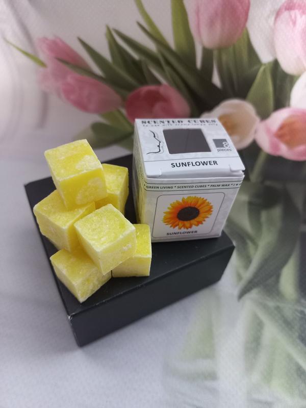 ароматические кубики с ароматом подсолнуха Ароматические кубики — это кусочки воска с ароматическими маслами, которые используются для ароматизации помещений. Они являются альтернативой свечам и эфирным маслам. Чтобы высвободить аромат, кубики помещают в специальную аромалампу (воскоплав), которая их растапливает. В расплавленном состоянии один кубик может ароматизировать помещение до 10 часов, а в сухом — до 4 месяцев. Обычно для ароматизации помещения площадью 100 квадратных футов (около 9,3 кв. м) достаточно 1–2 кубиков. Пересылаю укр почтой и новой почтой 132