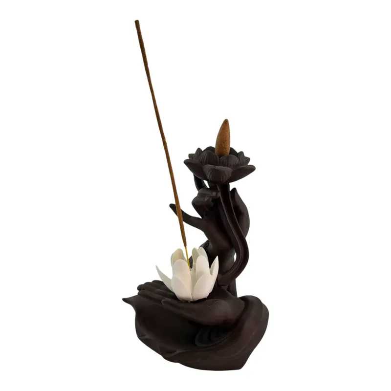 Эстетическая керамическая подставка в виде ладони с белым лотосом и цветком сверху. Подходит для палочек и конусов благовония: палочка устанавливается сбоку, конус ставится в верхний цветок. Форма направляет дым мягкими завитками и защищает поверхность от пепла. Подойдет для домашнего фонаря, уголка медитации, йога-студии или как приятный подарок любителям аромотерапии. Возможны небольшие отличия оттенков и фактуры.