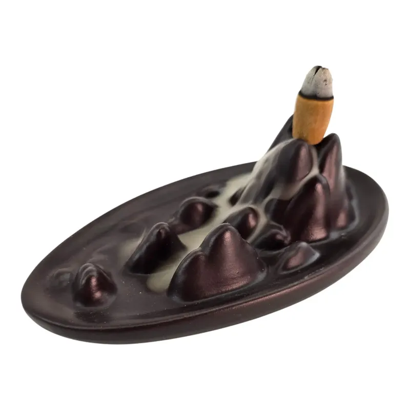 Компактна керамічна підставка для конусних пахощів типу backflow. Дим м'яко стікає по схилу гори, створюючи ефект водоспаду і туману. Використовуйте лише спеціальні конуси зі зворотним димом (backflow)