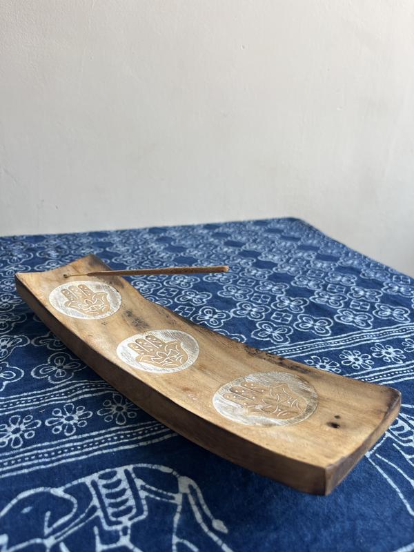 унікальну дерев'яну підставку для ароматичних паличок, що поєднує в собі функціональність та естетику. Цей аксесуар не лише допоможе створити атмосферу спокою та релаксації у вашому домі, але й стане цікавим елементом декору. Опис підставки: * Матеріал: Виготовлена з натурального дерева, що забезпечує довговічність та природний вигляд. * Дизайн: Підставка має видовжену, злегка вигнуту форму, яка чудово збирає попіл від аромапалички, підтримуючи чистоту. * Декор: Прикрашена трьома вирізьбленими або випаленими зображеннями "Руки Фатіми" (Хамса) – стародавнього оберега, що символізує захист, щастя та удачу. Ці елементи виконані в світлих тонах, що контрастують з темним деревом, надаючи підставці особливого шарму та етнічного колориту. * Функціональність: Має невеликий отвір для надійного кріплення ароматичної палички. На фото видно одну паличку, що вже розташована на підставці, демонструючи її готовність до використання. * Стан: Відмінний, без видимих пошкоджень, що свідчить про дбайливе використання. Ця підставка стане ідеальним доповненням для тих, хто практикує медитацію, йогу, або просто любить створювати приємну атмосферу вдома за допомогою ароматерапії. Вона також може бути чудовим подарунком для друзів та близьких, які цінують оригінальні та змістовні предмети інтер'єру.