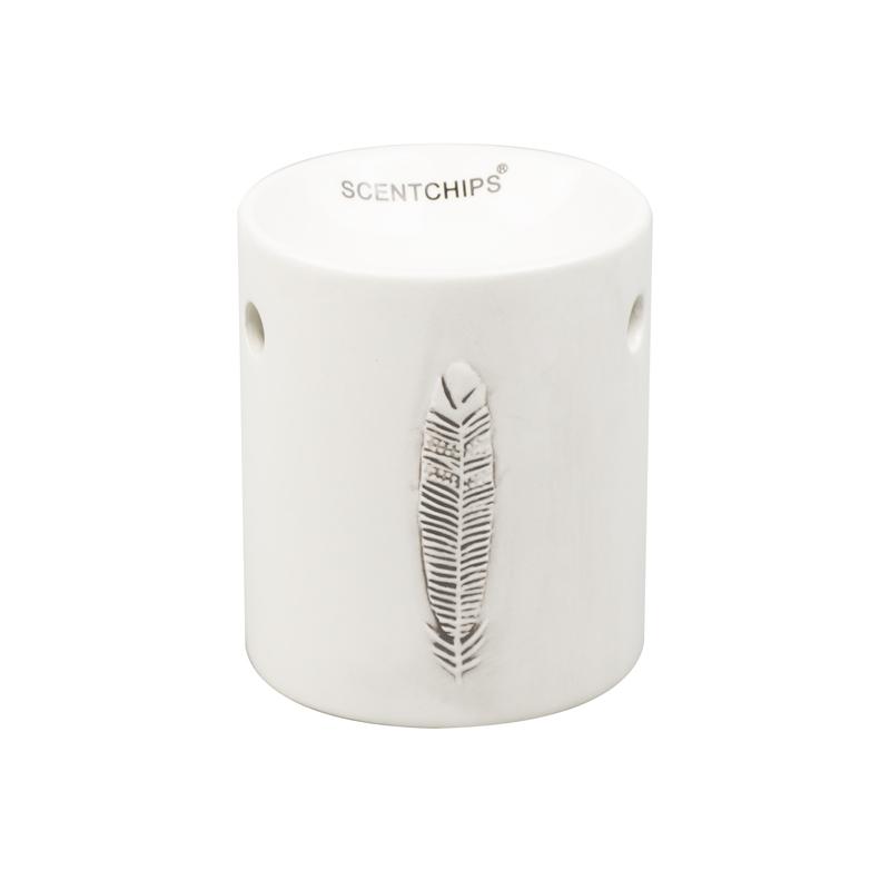 Керамічна аромалампа "Пір'їнка". Можна застосовувати як підсвічник, приємний і затишний елемент декору. Застосовується з будь-якими арома і ефірними маслами для ароматизації будь-якого приміщення. Колір білий глянцевий з об'ємним малюнком у вигляді пір'їнки. Scentchips. - виробництва Голландія. Розмір лампи 11×8.5 див.