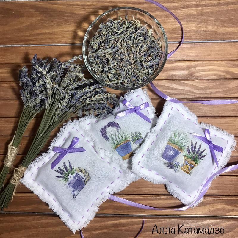 До вашої уваги ароматні саше для дому у вигляді подушечок.В декорі використаний декупаж на тканині. Наповнювач- виключно суцвіття французької лаванди з цьогорічного врожаю. Які ж вони запашні!!! Доречі, як використовувати: - у шафах для ароматизазії речей та білизни; - для відлякування молі; - на робочому столі для настрою; - у авто; - у сумочці для ароматерапії- дістати, трошки зім‘яти і настрій поліпшений; - біля ліжечка як заспокійливе та снодійне. Комплект з декількох подушечок може бути гарним подарунком для поціновувачів ароматерапії та не тільки. Аромат зберігатиметься протягом року та більше. У подальшому використанні можливе додавання декількох крапель лавандової ефірної олії. Таким чином термін використання майже необмежений. Ціна вказана за одну штуку. Розмір подушечок 10*10 см (- 1-2 см).