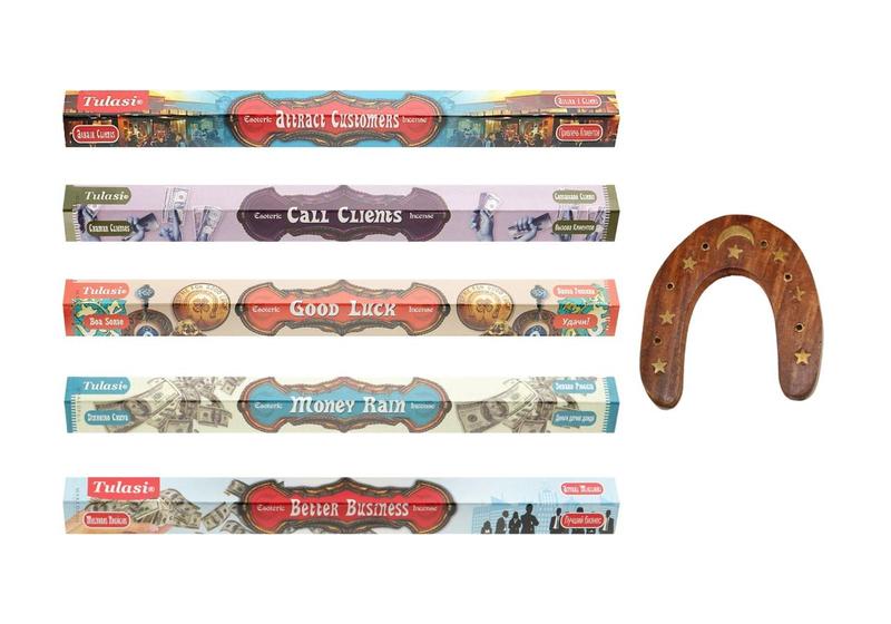 Индийские ароматические палочки не зря заслужили признание во многих уголках мира – благовония имеют многочисленные полезные свойства: приятные ароматы эффективно расслабляют нервную систему, способствуют качественному отдыху, релаксации и медитации, помогают поднять настроение даже в самый пасмурный день! В набор входят 5 упаковок благовоний Tulasi + подставка для аромапалочек Подкова: - Attract Customers (Привлечение Клиентов); - Call Client (Вызов Клиента); - Good Luck (Удача); - Money Rain Esoteric (Денежный Дождь); - Better Business (Успешный Бизнес). Характеристики: Благовония изготавливаются вручную, поэтому количество палочек может варьироваться. Время горения 30-40 минут на каждый стик. Состав палочек радует своей экологичностью: бамбуковая основа, натуральный древесный наполнитель, лучшие натуральные индийские ароматические масла. Комбинация таких компонентов позволяет избежать лишнего дыма и чада при тлении. Деревянная подставка для благовоний используется для безопасного воскуривания ароматических палочек. Эта подставка надежно зафиксирует палочку и защитит мебель, одежду от попадания горячего пепла при тлении благовония.