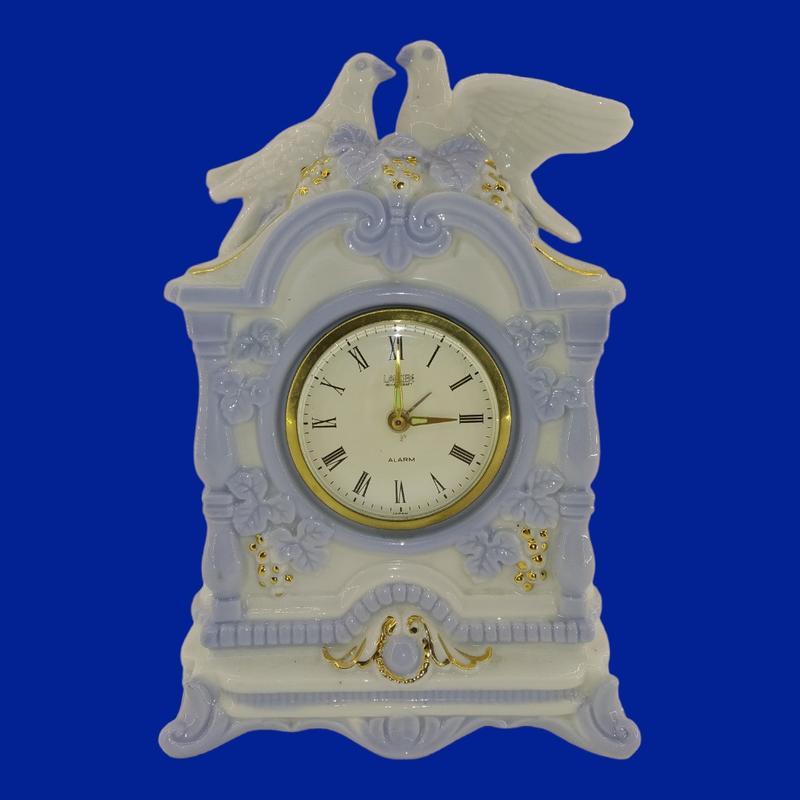 Керамические часы-будильник арт. 0300 Материал: Керамика Вес: 0,539 кг Размеры: ширина: 14 см высота: 20 см толщина: 7 см Механизм: механика Дефект: сломанное крыло Период: после 1940 года Диаметр циферблата: 6 см