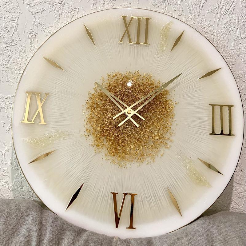 Настенные часы из серии EPOXY - это воплощение красоты эпоксидной смолы в сочетании с практичностью, в которую вложена частичка души мастера и его талант. Именно эти часы придадут особого шарма вашему дому. Диаметр часов на фото - 32 см. Каждое изделие делается вручную и все узоры уникальны. Поэтому вы можете быть уверены, что ваших часов не будет больше ни у кого. Под ваш интерьер мы с радостью подберем удачную цветовую гамму и нужный размер. Срок изготовления - до 7 дней. Дайте волю фантазии, и мы воплотим все ваши мечты в жизнь. - Можно заказать во всех цветах и добавить гравировку - Размеры - от 23 до 100 см в диаметре - Цифры римские/арабские - Можно добавить натуральные, полудрагоценные и искусственные камни - Золотые или серебряные зеркальные стрелки и деления (на выбор) - Высокоточный бесшумный механизм с плавным ходом - Есть петля на механизме для подвешивания Интересно, как будут создаваться ваши часы? Смотрите обзор:
