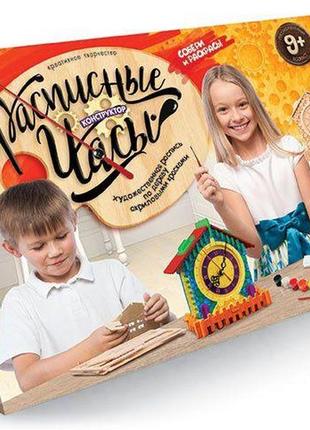 Годинник-конструктор "Домик". Зберіть деталі заготівки-конструктора для збирання годинника, з'єднайте інші деталі конструктора. Потім, за допомогою губки, проґрунтуйте годинник білою фарбою (в наборі), розфарбуйте годинник. Одягніть часову, потім хвилинну та секундну стрілки на годинник._ Бренд: Dankotoys Паковання: Коробка Колір: Різнобарв Вага в упаковці: 480 г Габарити в упаковці: 34 x 3.5 x 25.5 см Габарити без паковання: 34 x 4 x 26 см Страна виробник: Україна Матеріал: Дерево Комплектація: Деталі годинника (стрілки, годинниковий механізм, елементи конструкції), фарби (12 кольорів), пензлик, губка, фарба для ґрунтування, інструкція