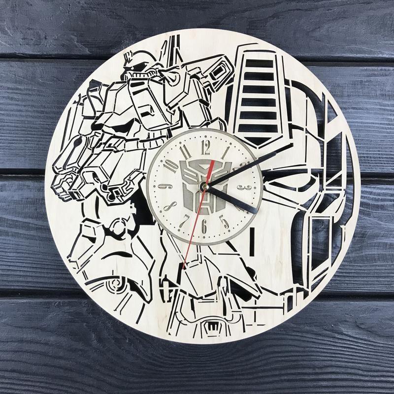 Тематические настенные часы - станут отличным вариантом подарка фанату легендарного фильма «Трансформеры»! С таким оригинальным дизайном часы будут смотреться просто отлично и будут гармонично дополнят интерьер. Также мы можем изменить дизайн часов или разработать новый, поскольку являемся непосредственным их производителем. По Вашему желанию можем стилизовать часы из дерева под любой фильм и любого персонажа, чтобы он понравился именно Вам. Диаметр - 30 см; Цвет - натуральное дерево. Дополнительные характеристики: Материал : Фанера Форма: Круглые
