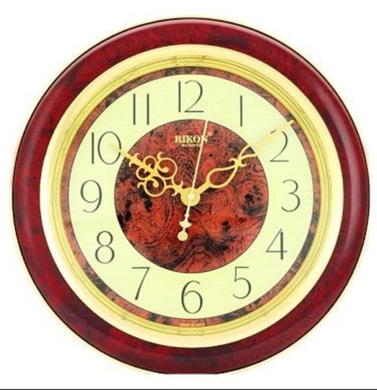 Розмір:28см*28см.Механізм:кроковий хід Годинник настінний RIKON 4451 якісний, виробництва Індії, круглої форми, кварцові. Працюють на батарейці (пальчикова — елемент АА). До комплекту не входить. Механізм кроковий. З лицьового боку по діаметру йде вставка під дерево, циферблат білого кольору з чорними цифрами та стрілками. Навколо циферблата вставка під метал жовтого кольору.