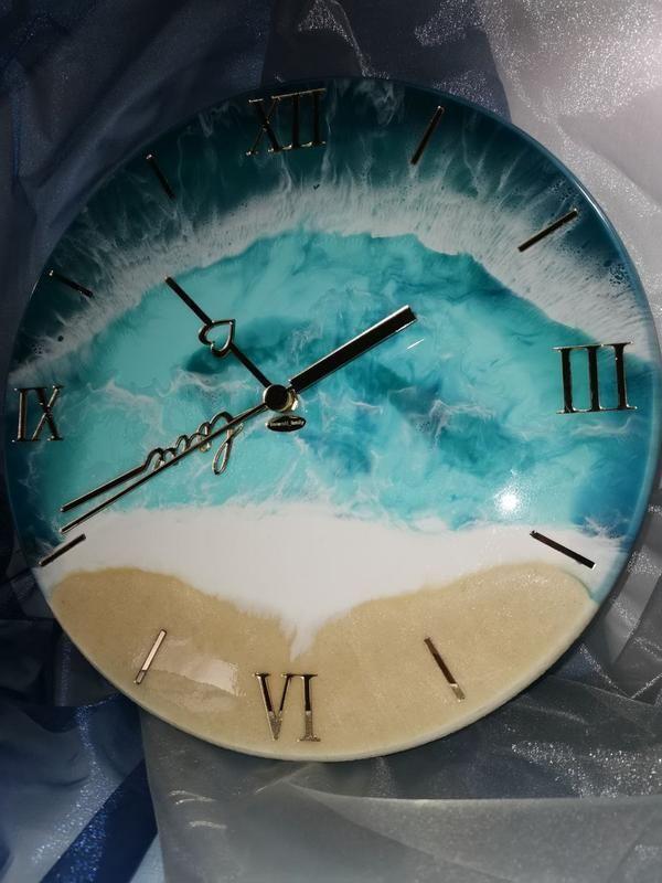 Годинник 40 см діаметром Виготовлений із епоксидної смоли Безшумний механізм Додаткові характеристики: Колір: Білий Колір: Зелений Колір: Синій Матеріал: Дерево Форма: Круглі