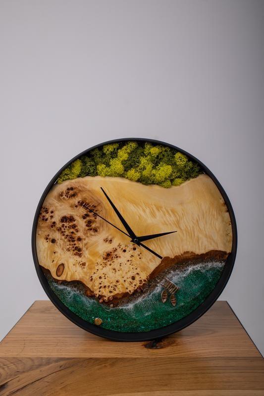 Настенные часы из смолы, дерева и мха, лофт часы, часы с черной металлической рамой, часы...