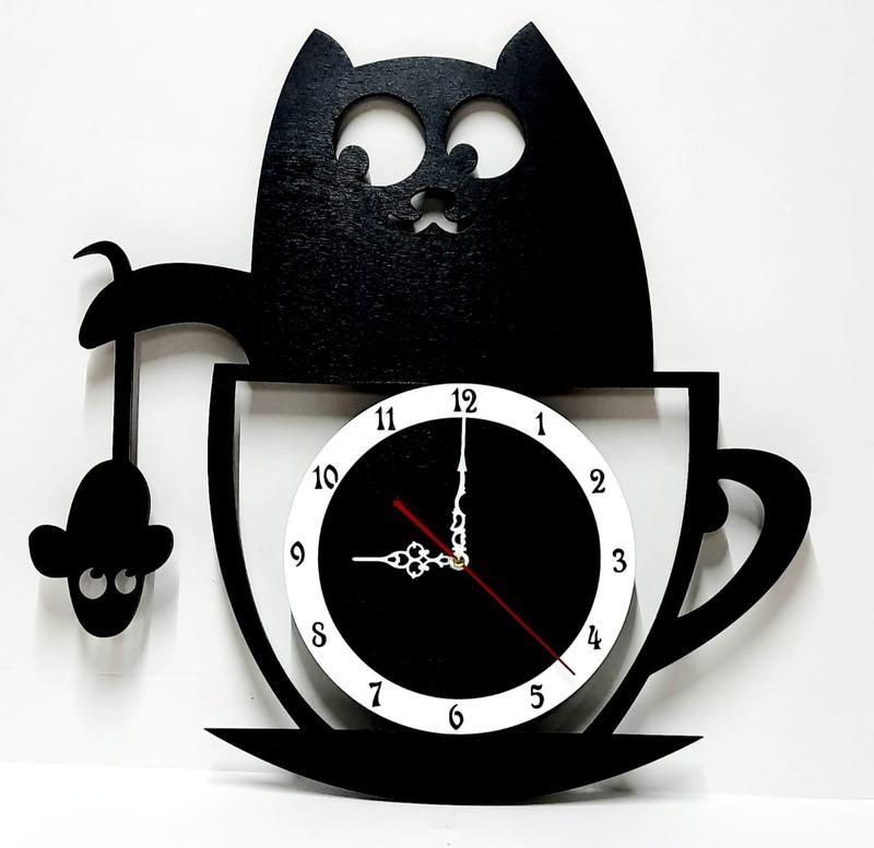Часы настенные ′кошка в чашке′ из дерева 40х40 см