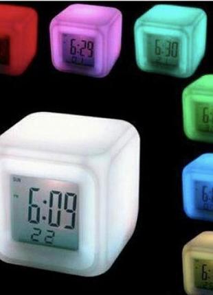 Годинник Кубик Хамелеон Характеристики: Колір годинника, що постійно плавно змінюється. 7 основних кольорів Відображають час, дату та температуру 24 годинне відображення часу Відображення температури в C (Цельсій) та F (фаренгейт) Будильник (8 мелодій на вибір) Мають вхід для блока живлення 4.5V (немає в комплекті) Розміри годинника: 8x8x8см Розміри екрану: 5.2x5.2см Для підсвічування використовують 4 ААА батареї (немає в комплекті)