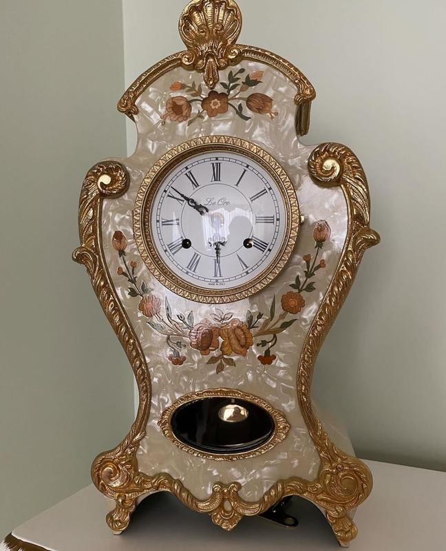 Механічний камінний годинник виробництва Італії. Le Ore. з інкрустацією перламутром і візерунками з дорогоцінної деревини. Метал покритий сусальним золотом 24 карата, механізм і ключ - латунь. габаритні розміри 43/25/11 см. У Києві.