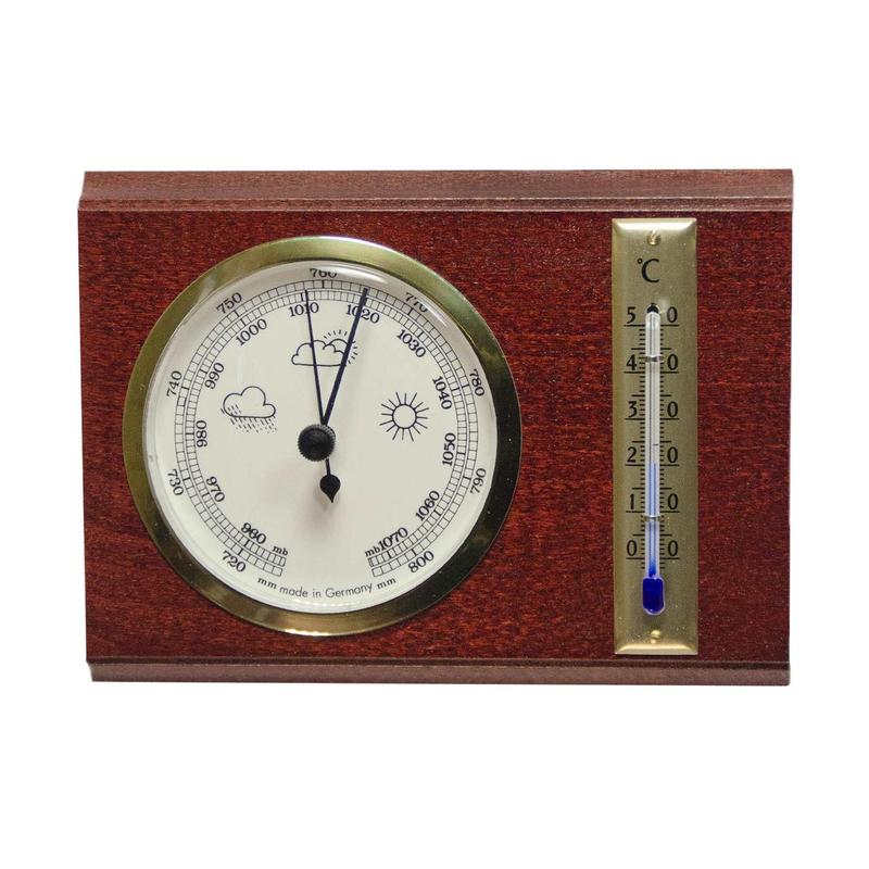 Настенная метеостанция Moller 202212 Mahagony состоит из барометра и термометра, объединенных в деревянном корпусе. Вся продукция Moller производится из твердых пород дерева, а именно из бука, поверхность шлифуется, после чего корпус покрывается специальными составами лака для придания необходимой долговечности, цвета и текстуры древесины красного дерева. Барометры Moller адаптированы для нашего рынка и имеют шкалу не только в гектопаскалях, но и в миллиметрах ртутного столба. Качество и надежность продукции Moller подкреплены пятилетней гарантией. Moller Therm GMbH является семейной компанией в третьем поколении, которая вот уже более 50 лет специализируется на производстве аналоговых интерьерных барометров, гигрометров и термометров, предназначенных для домашнего использования. Даже во время мировой глобализации все производство компании до сих пор размещено исключительно в Германии, в поселке Кройцвертгайм (Бавария). По сегодняшним меркам компанию можно назвать крафтовым производителем, изготовляющим свою продукцию из натурального дерева исключительно под заказ. Таким образом производитель может проконтролировать качество своей продукции и без опаски предоставить гарантию сроком 5 лет на свои изделия. Функции: Прогноз погоды: - Прогноз погоды на 8-12 часов (циферблат отображает погоду, которая прогнозируемо установится через 8-12 часов) - Символьный прогноз погоды. На циферблате нанесены три символа (ясно, переменная облачность, дождь) - Прогноз погоды определяется по направлению движения стрелки барометра относительно маркерной стрелки Атмосферное давление: - Единицы измерения: мм. рт. ст., мбар или гПа (Миллиметры ртутного столба / Миллибары или Гектопаскали). - Диапазон измерения атмосферного давления : от 715 мм. рт. ст. до 805 мм. рт. ст. (от 953 мбар до 1073 мбар или от 953 гПа до 1073 гПа). - Разрешение измерения: 1 мм. рт. ст. (1 мбар, или 1 гПа) - Точность измерения: +/- 5 мм. рт. ст. (+/- 5 мбар или, +/- 5 гПа) - Отображение тенденции атмосферного давления (Отклонение стрелки влево от маркера - давление падает / Отклонение стрелки вправо от маркера - давление растет) - Возможность калибровки Температура в помещении: - Единицы измерения: ºС - Диапазон измерения: от -2°C до +50°C - Разрешение измерения: 1°C - Точность измерения: +/- 1C° Характеристики и комплектация: Циферблат: - Размер циферблата барометра: 90x90 мм; - Цвет циферблата: белый; - Цвет оправы циферблата: под золото; Особенности конструкции: - Материал корпуса: натуральное дерево (бук) - Установка: на стене - Цвет корпуса: Mahagony (красное дерево) Комплектация: - Метеостанция - Инструкция на украинском языке Размеры и вес: - Размеры метеостанции без упаковки, мм: 158х116х38 - Размеры в упаковке, мм: 160х120х40 - Вес метеостанции без упаковки, кг: 0.260 - Вес в упаковке, кг: 0.315 Срок гарантии: 5 лет Производитель: Moller (Germany)
