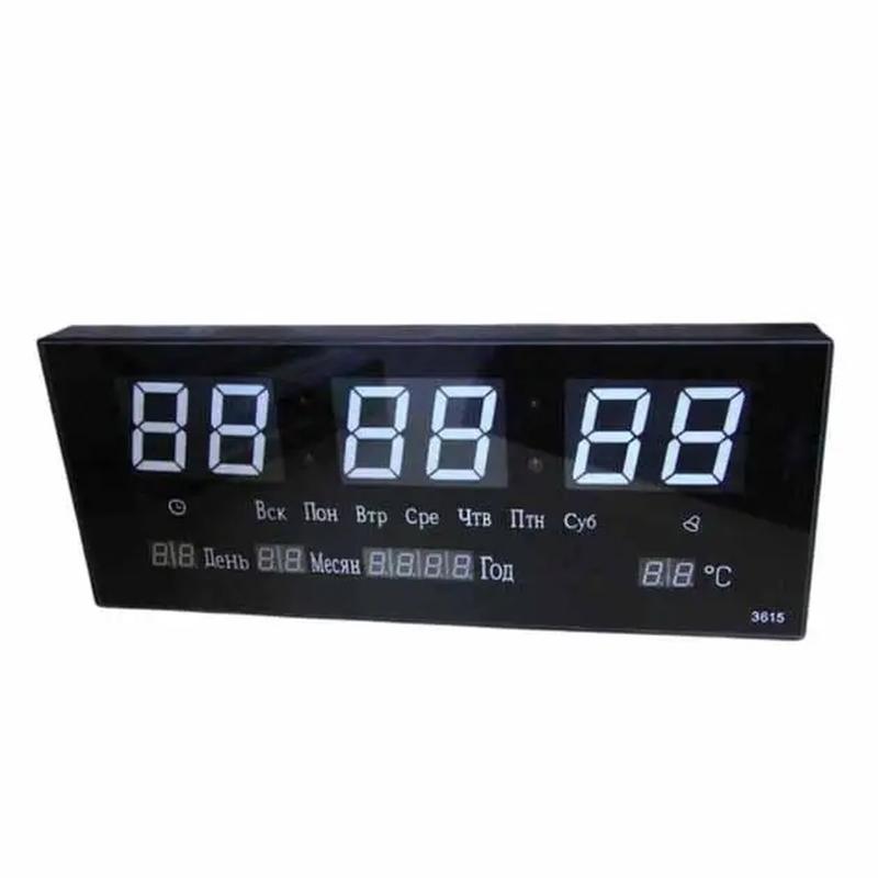 Настенные электронные часы с календарем и термометром VST-3615 (Белое свечение) Часы компактны и просты в управлении. Благодаря простой форме и отсутствию лишних элементов дизайна часы легко впишутся в любой интерьер. Большой размер 36x15 см. Календарь достаточно информативный, что включает в себя поля для даты, месяца и текущего года, и главное есть большое поле для отображения дней недели, что не может не радовать.Часы идеально подходят для офисных и производственных помещений, вахт, коридоров, аудиторий. Современный дизайн, а также удобное и легкое управление делают их, простыми в использовании. Точность показателей времени - колебание погрешности не более 0,5 секунды в сутки. Настенные часы, не обычные электронные часы, это LED отображение, то есть множество светодиодных мелких лампочек создает изображения часов, что намного экономит электроэнергию. На тыльной стороне часов находятся четыре кнопки A/B/C/D, с помощью которых, выставляются цифровые показатели на светодиодных часах (часы, минуты, дата, будильник, температура), а также отверстие динамика, и отверстия для креплений настенных светодиодных часов LED Number Clock 3615 к стене. Электронные часы с большим LED табло на котором размещены: Время; Термометр; Встроенный термодатчик, который отображает текущую температуру и малейшее ее изменение на 1 градус; Календарь; Характеристики: Тип: часы Тип часов: настенные Тип механизма: электронный Индикация времени: светодиодная Материал корпуса: пластик Размер: 36×15×2,5 см Длина кабеля: 1 м Автоматическая настройка яркости Точность показателей времени - колебание погрешности не более 0,5 секунды в сутки Показания температурного режима в помещении; Встроенный будильник (имеет несколько мелодий) RESET - для возврата к заводским настройкам; Устойчивость к внешним вибрациям; Многофункциональность; Экономичность и долговечность; Простота в эксплуатации; Модный современный дизайн. Комплектация: Цифровые настенные часы VST -3615 Led Белые; Кабель; Блок питания; Упаковочная коробка.