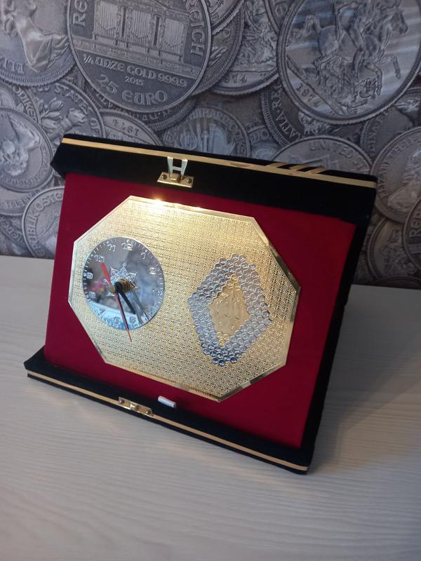 Состояние хорошее. Часы рабочие кварцевые на одной батарейке АА . Часы настольные с арабской вязью в бархатном футляре с позолотой размеры футляра 21х26х6 см