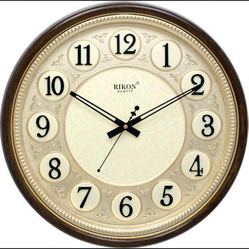Годинник фабричного виробництва, круглої форми, циферблат з чорної арабської цифрою. Виробник Rikon Розмір годинника: 38 см. Матеріал: екологічно чистий пластик. Циферблат яскравий із добре вираженими арабською цифрою, під склом. Кварцовий механізм, хід механізму плавний, довговічний, тип живлення механізму 1 — на батарейку типу AA (пальчикова батарейка). Характеристики Основні Виробник Rikon Країна виробник Індія Тип механізму Кварцовий Індикація часу Стрілкова Матеріал корпусу Пластик Колір корпусу Коричневий Форма Кругла Тип годинника Настінний Стан Новий
