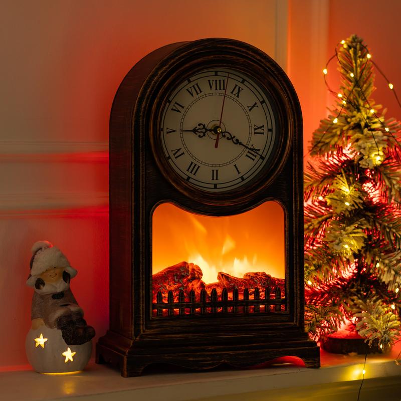 Оригинальный новогодний светильник в виде миниатюрного камина с часами станет стильным украшением вашего дома в праздничный сезон. Тёплое мерцание подсветки имитирует огонь, создавая уют и атмосферу зимнего вечера у камина. Изделие украшено новогодними деталями -- еловыми веточками, снежинками, декоративными часами -- и станет центральным элементом декора гостиной, спальни или праздничного стола. Основные характеристики декоративного новогоднего светильника: Материал корпуса: пластик; Размеры: 14.5×12×27 см; Питание: USB / большие батарейки (не входят); Эффект: LED-подсветка с имитацией тлеющего угля. Создайте тёплую и уютную атмосферу в вашем доме с этим стильным декоративным светильником в виде часов-камина -- безопасным, компактным и невероятно декоративным аксессуаром, который станет идеальным дополнением интерьера или праздничного декора.
