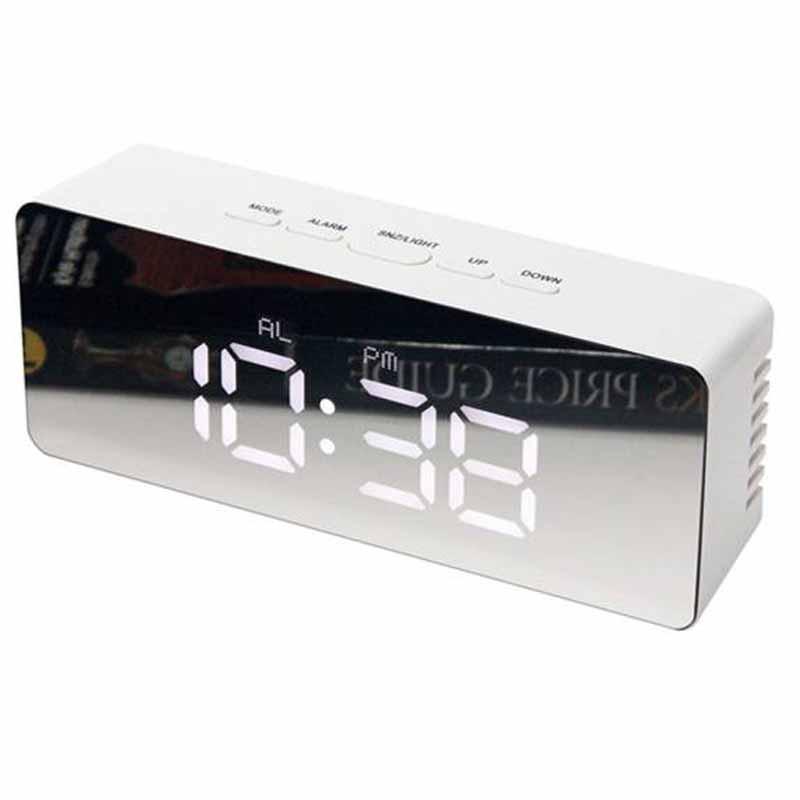 Модные настольные часы. Имеют отражающий циферблат, сквозь который видно время. Два режима подсветки циферблата: яркий дневной и тусклый ночной. Термометр. Размер: 14/5,5/3,5 см Сигнальный звук: электронный с нарастающей частотой сигнала каждые 10 секунд Подсветка: два режима - яркий (кнопка "Light") и тусклый (кнопка "UP"+"Light"). При работе от батареек длительность подсветки после нажатия на кнопку около 10 секунд. При работе от сети подсветка светит в непрерывном режиме. Термометр: есть Тип батареи: два режима питания - ААА - 3 шт, не входит в комплект - через usb кабель, входит в комплект, напряжение 5 Вт