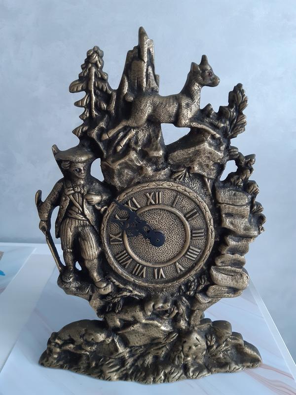 Антикварний бронзовий годинник на бронзовій підставці.Тема-полювання.Стара ручна робота.Дуже масивний і важкий. Механізм кварцовий.Стан відмінний,без дефектів.Дивиться стильно і добротно.Вага 5 кг.