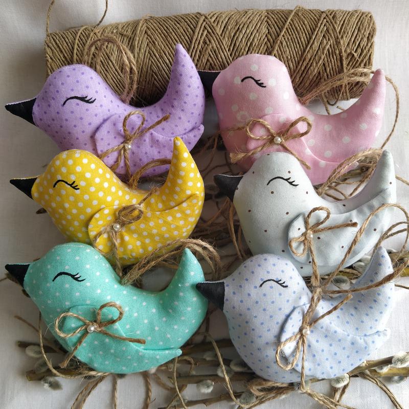Текстильные птички на настоящие вербовые веточки "котиках". Изготовлены из натуральной ткани, детали закреплены ручными швами, веточки привязаны с помощью натурального жгута. Птички на подвеске, длина регулируется.