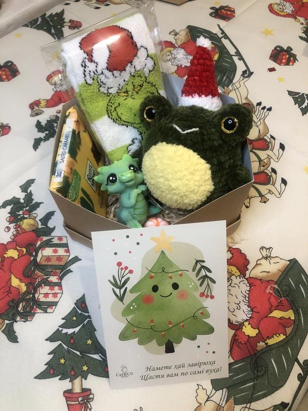 Подарочные боксы к Рождественству и Новому Году 700 грн каждый В боктиках с лягушками: Вязаная игрушка Шоколадка Мило дракон Мило мандарин Открытка Носки с Гринчем В боксике с восьмином: Игрушка вязаная Аромасаше воскове Шоколадка Мило дракончик Мило мандарин Желейные червячки Праздничные носки
