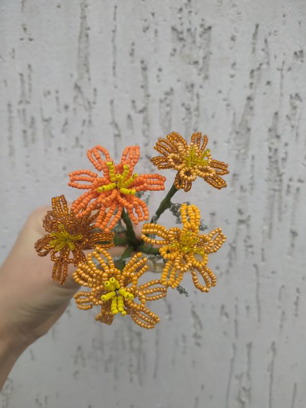 Изысканный букет с хризантем, навевает тепло осенних оттенков 🍁в вашей жизни. Каждый цветок, будто капля солнца, выполнен с детальностью из бисера оранжевого🏵️ и желтого цвета. Это неповторимое композиционное произведение добавит атмосферу уюта и красоты в любом помещении.🌼 Подарите лучшее впечатление с этим великолепным букетом, который поражает своей уникальностью и теплом.❤️ 📸 Фото без фильтров. 📏Высота букета 14 см. 💐 Количество 5 шт.