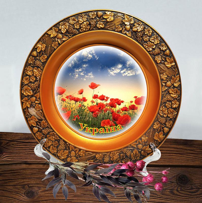 Декоративная тарелка Украина поле маков изготовлена методом ручной формовки с холодной керамики.Материал очень прочный и долговечный, приятный на ощупь.Не теряет форму, не деформуеться.Не требует дополнительных средств по уходу. Декоративное покрытие акриловыми красками "под старину" .Изображение - высококачественная фотопечать. Изображение не теряет цвета и является долговечным. Тарелка покрыта лаком на водной основе. Диаметр 23см. Крепится на стену, в тарелку встроенный подвес для крепления на стене. Ставится на подставку, как декор для полки или стола. Подставка в комплект не входит.Заказывается отдельно. Использованы только экологически чистые материалы. Изготовим сувенирную тарелку по Ващим сюжетам. К юбилею,ко дню рождения,в подарок и т.п.