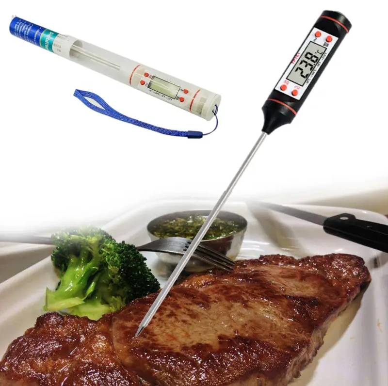 Виробник: Інший виробник Тип: Термометри Кілька примірників у наявності Кулінарний термометр призначений для вимірювання температури продуктів перед приготуванням їжі. Зазвичай кухаря, домогосподарки або кондитери мають дотримуватися однакового температурного режиму для всіх інгредієнтів в одній страві, щоб отримати в підсумку щось смачне. Використовувати такий термометр безпечно для самих продуктів. Особливість цієї моделі — довгий щуп, яким можна проткнути якусь поверхню або опустити його в рідину. Таким термометром можна навіть виміряти температуру в повітрі або лабораторних елементах. Термометр такого типу призначений переважно для кухні. Тому користуватися ним зручно під час приготування страви. На екрані залишаються дані за останнім виміром — навіть якщо ви забули щось відновити це буде просто. Працює термометр на батарейках, але заряд може триматися приблизно 200 годин безперервного застосування. Можна перемикати параметри між одиницями вимірювання: з Цельсія на Фаренгейт. Характеристики: Матеріал: пластик, неіржавка сталь Діапазон розпізнавання температури: від -50 °C до +300 °C Комплектація: Цифровий кулінарний термометр — 1 шт. Кейс для зберігання — 1 шт. Інструкція — 1 шт.